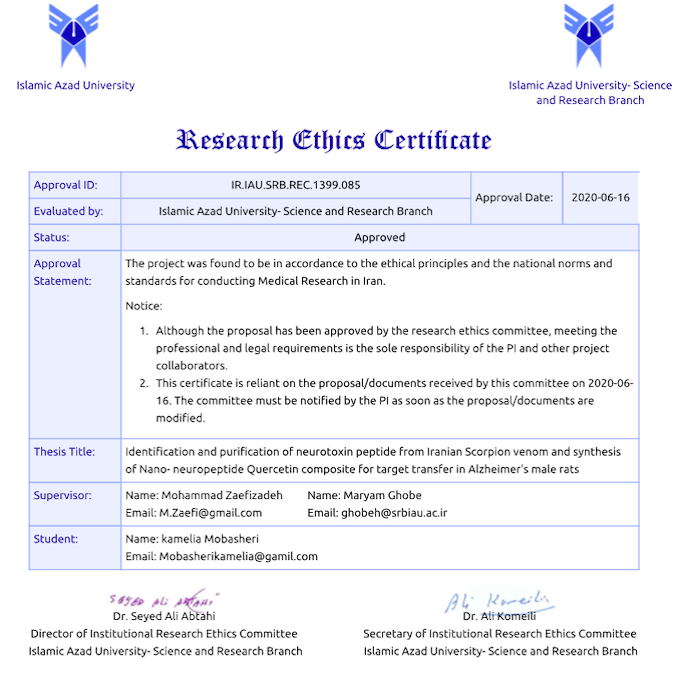 Identification and purification of neurotoxin peptide from Iranian Scorpion venom and synthesis of Nano - neuropeptide Querectin composite for target transfer in Alzheimer’s male rats